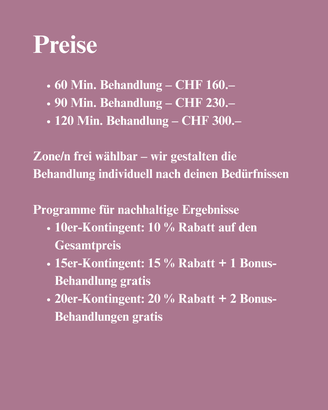 Die Behandlung ist sicher, schmerzfrei und nicht-invasiv – und wird individuell auf deine Bedürfnisse abgestimmt. Schon nach der ersten Sitzung sind Ergebnisse spür- und sichtbar.